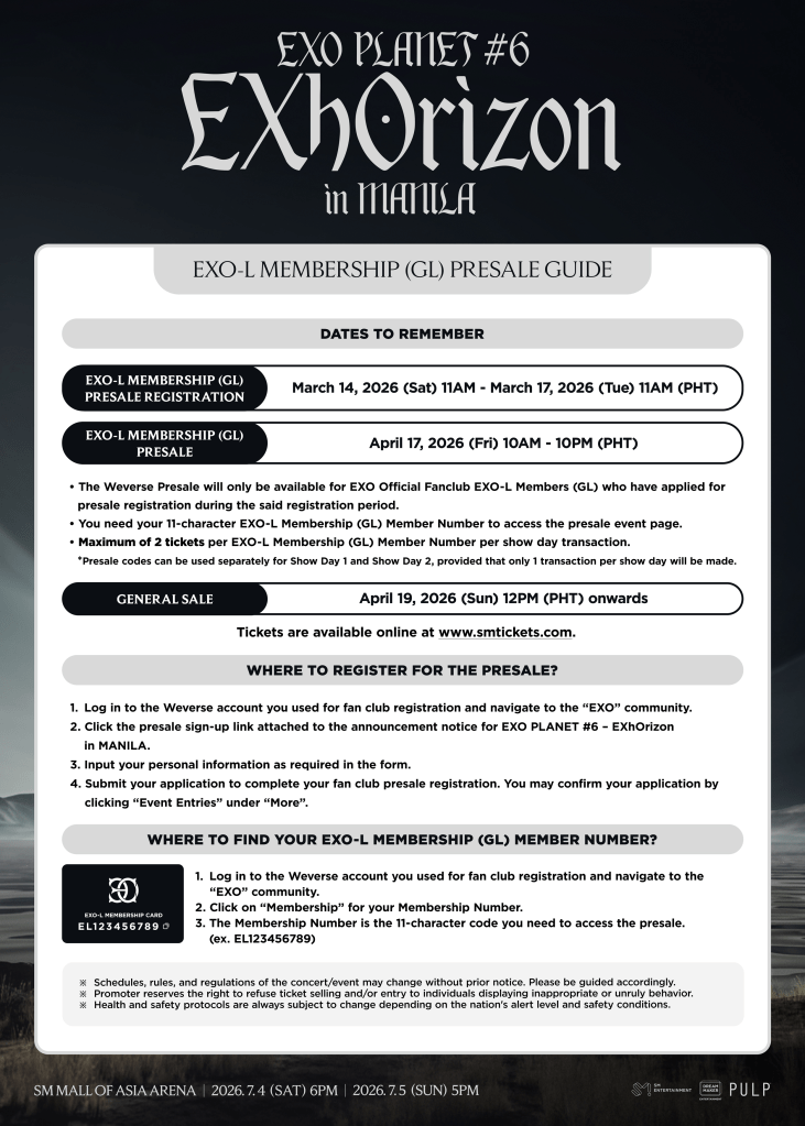 The EXO-L Membership (GL) Presale will then be held on April 17, 2026 from 10:00 AM to 10:00 PM PHT, with tickets available through SM Tickets online.